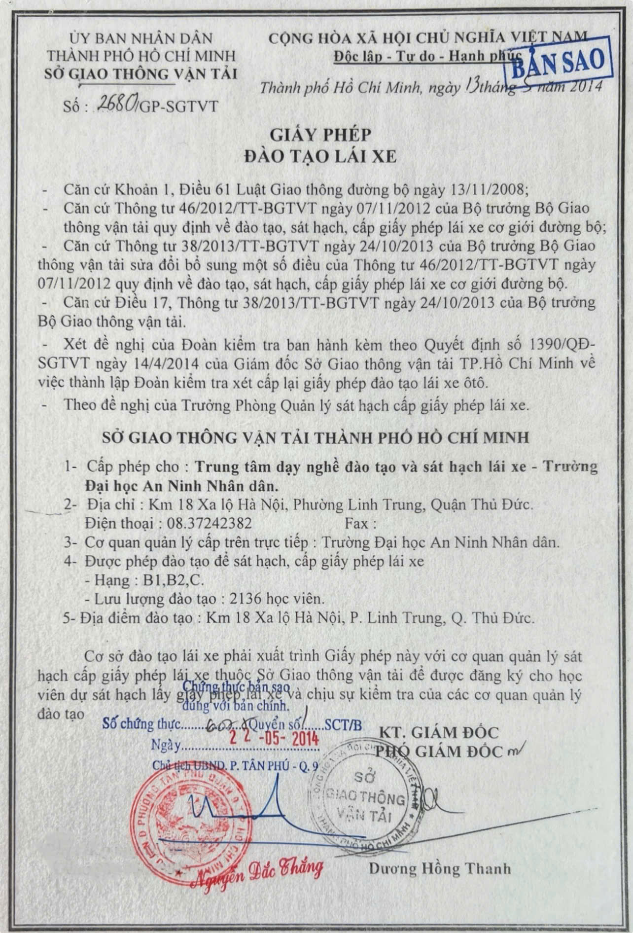 GIẤY PHÉP ĐÀO TẠO VÀ LƯU LƯỢNG CỦA TRUNG TÂM SÁT HẠCH LÁI XE ĐẠI HỌC AN NINH NHÂN DÂN